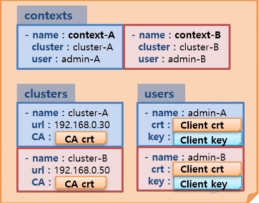 - contexts: clusters와 users를 연결