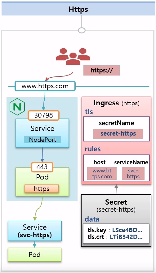 - Nginx 파드를 https로 사용하려면 443포트로 파드와 연결해야 함