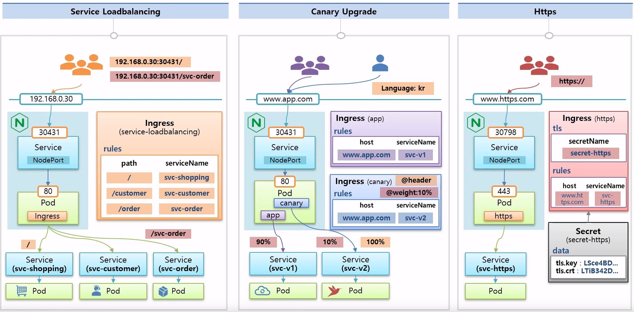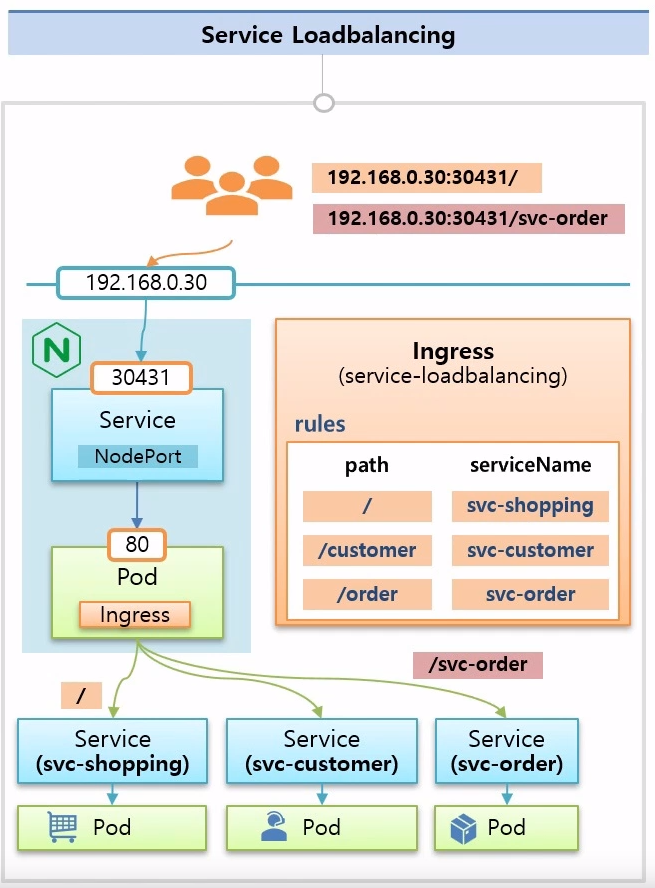 192.168.0.30:30431로 접속하면 파드의 80번 포트로 접속되게 함- 이 때, Ingress를 만들고 rule을 각 path마다 의도하는 서비스로 매칭