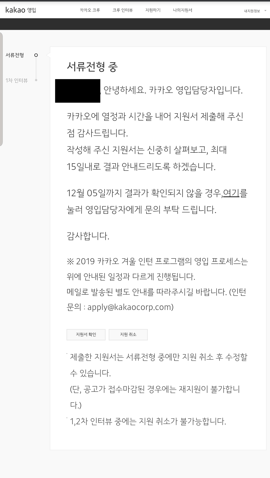 원래 서류 제출 후 2주 내에 연락 없으면 연락 달라는 거였는데, 이런식으로 바뀌었다!!!!