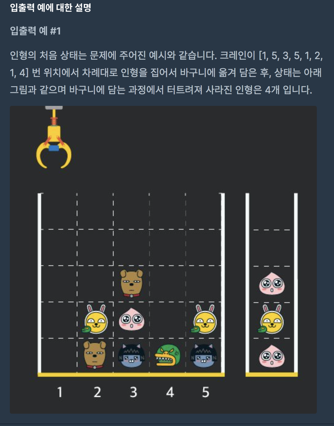 인형을 뽑아서 stack에 넣고 stack에 맨 위에 있는 거랑 새로 들어오는 거랑 같으면 삭제 됨.