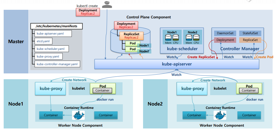 - Etcd에 ReplicaSet 정보 저장, ReplicaSet은 또 kube-apiserver에서 생성 감지하여 replicas 숫자에 맞는 파드 생성 요청