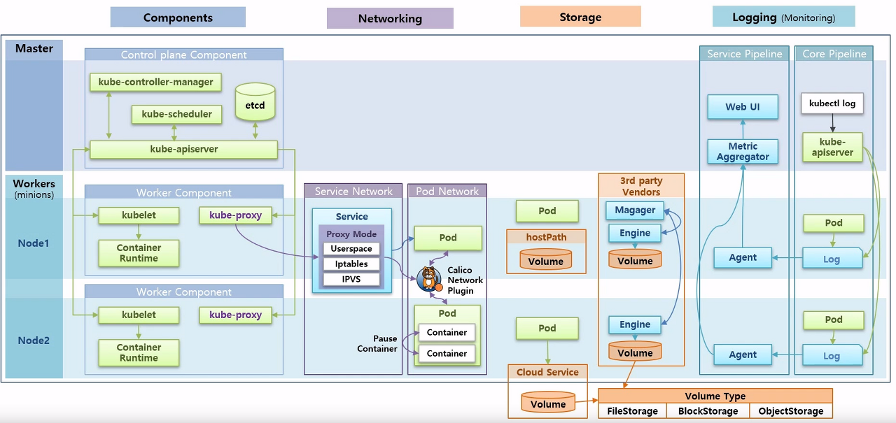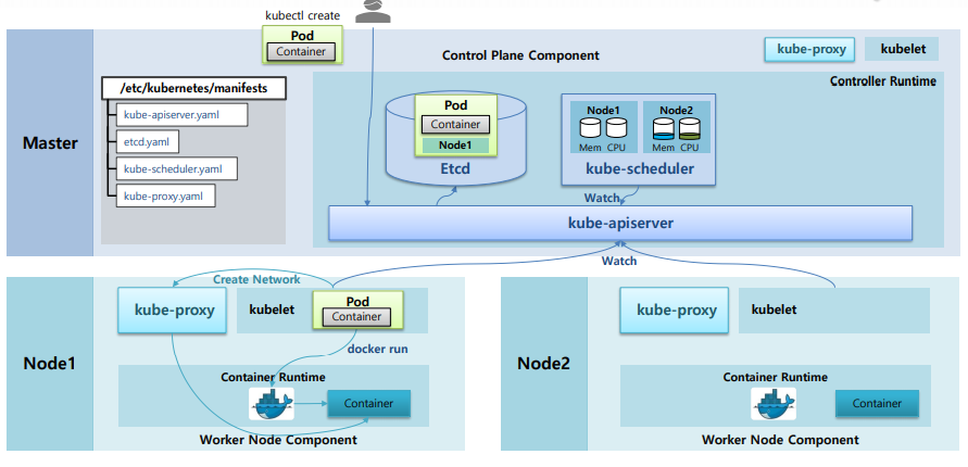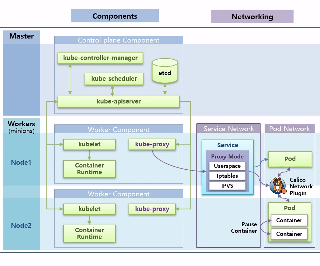 - 마스터 노드는 Control plane Component, 워커 노드는 Worker Component