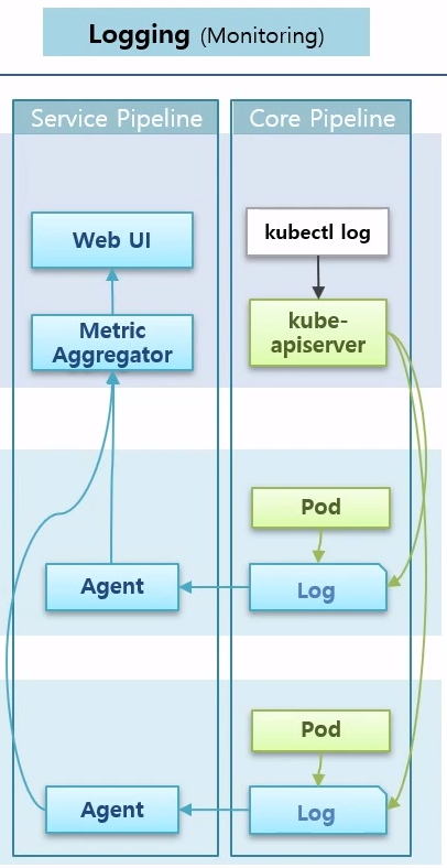 - 파드들이 각각의 노드에서 로그를 수집서버에 모으고 UI를 통해 사용자에게 보여줌