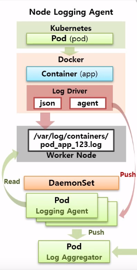 - 이 구조에 DaemonSet을 둬서 Worker Node에 만들어지는 각 경로의 로그들을 읽는 형태