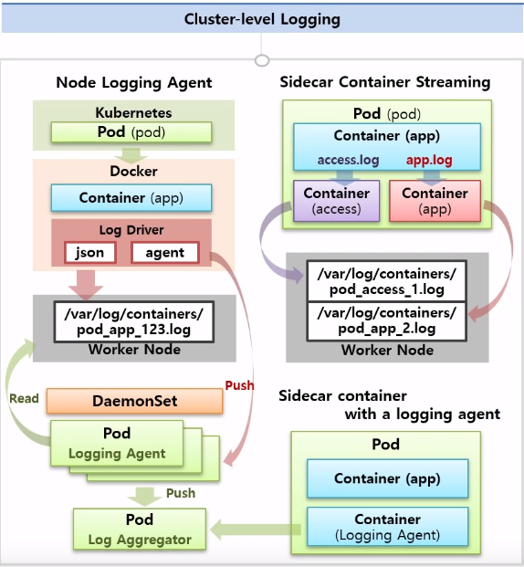 - 따라서 파드가 죽고 나서 로그를 보기 위해 Cluster-level Logging이 필요