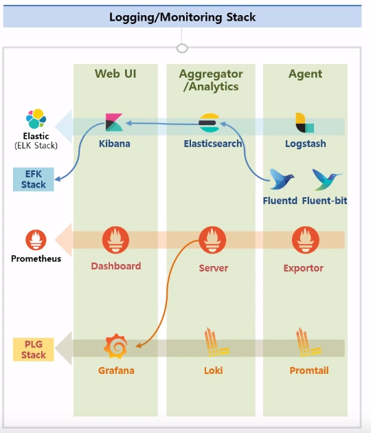 - 대부분의 로깅과 모니터링 플러그인은 Web UI, Aggregator/Analytics, Agent 구조를 가지고 있음