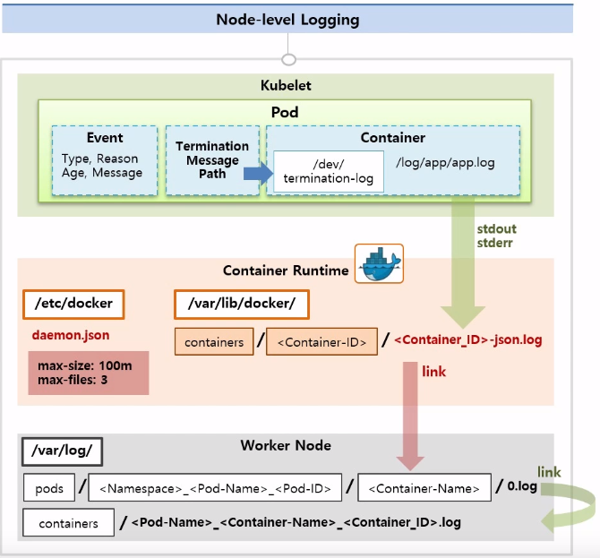 /var/lib/docker/containers/<Container-ID>.json.log로 만들어짐 - 이 파일을 쿠버네티스에서 Worker Node에 Link함