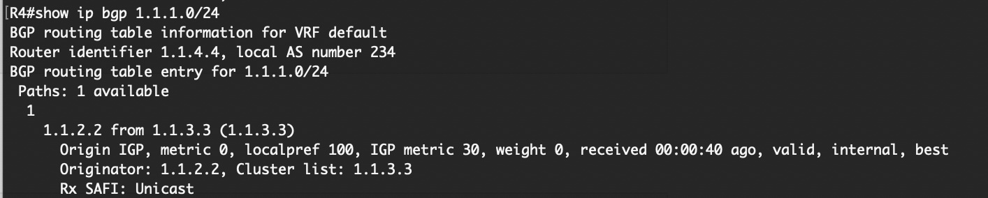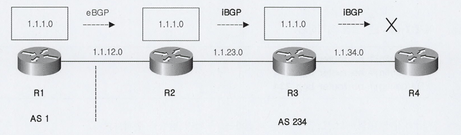 - R3에서 iBGP로 광고받은 것을 다시 iBGP peer에게 광고하지 않기 때문에 R4에서는 1.1.1.0에 대한 정보가 없음.