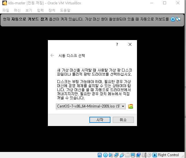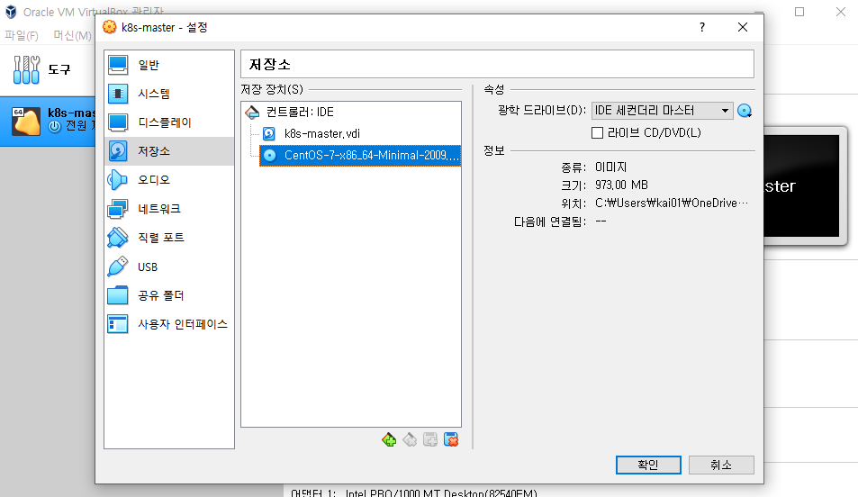 6. [VM 생성 후 저장소 설정] 컨트롤러:IDE 하위에 있는 광학드라이브 클릭 > CentOS 이미지 선택 후 확인