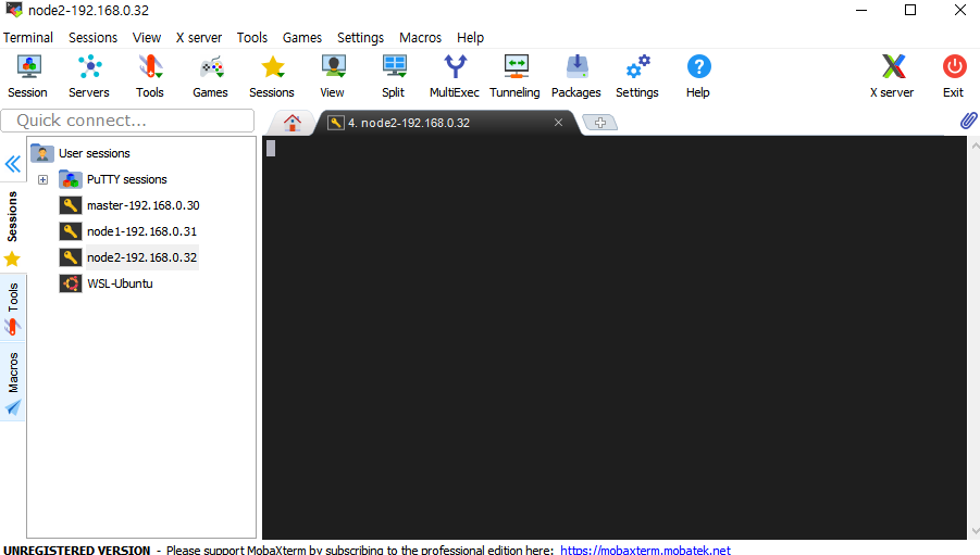 - Sessions > SSH > Remote host : 192.168.35.32 > [Bookmark settings] Session name : node2-192.168.35.32 > [ok]