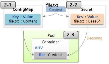 - ConfigMap, Secert은 데이터로 상수, 환경변수 파일, Volume Mount 파일로 설정 가능