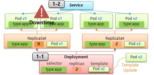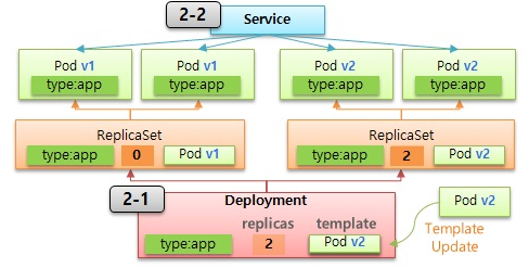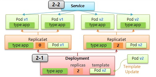 - 서비스가 운영중인 상태에서, Deployment에서 새로 템플릿을 v1에서 v2로 교체