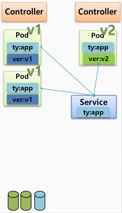 - 또 다른 컨트롤러에 ty:app라벨과 ver:v2라벨을 붙인 파드를 만들고 위에 나온 서비스에 연결시킴