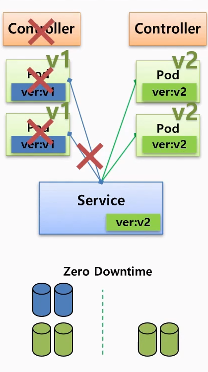 - Zero Downtime이고, 자원 사용량은 최대 2배까지 필요