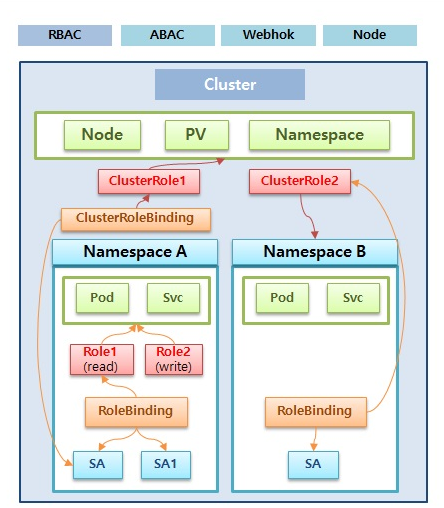 - 그림에서 보면 SA와 SA1은 Role1과 연결 돼 Namespace A의 Pod와 SVC에 접근할 수 있음