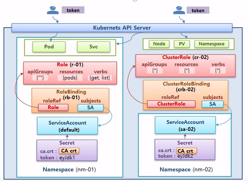 - Service Account에 Role과 Role Binding을 어떻게 설정하느냐에 따라 해당 Service Account는 네임스페이스 자원에만 접근할 수 있거나 클러스터 자원에도 접근할 수 있음