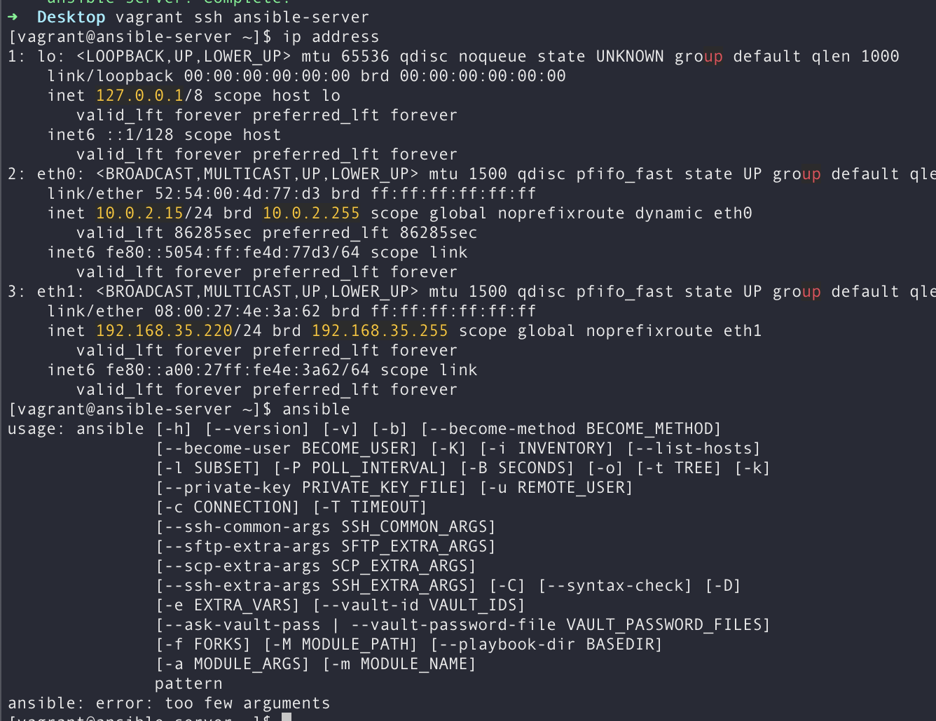 vagrant로 설치한 vm에 ssh로 접근하여 ip 가 원하는대로 설치되어있는지, ansible은 잘 설치되었는지 확인할 수 있음!